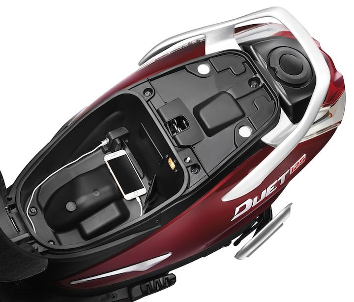 There are dual tone ascents all around the scooter with body coloured rear view mirrors adding to the visual appeal of the Duet 125 CC.